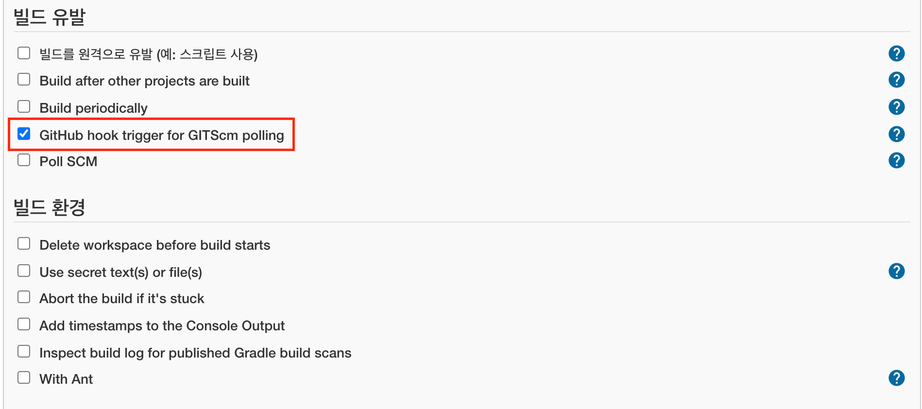 빌드 유발은 GitHub hook trigger for GITScm polling 을 체크합니다.