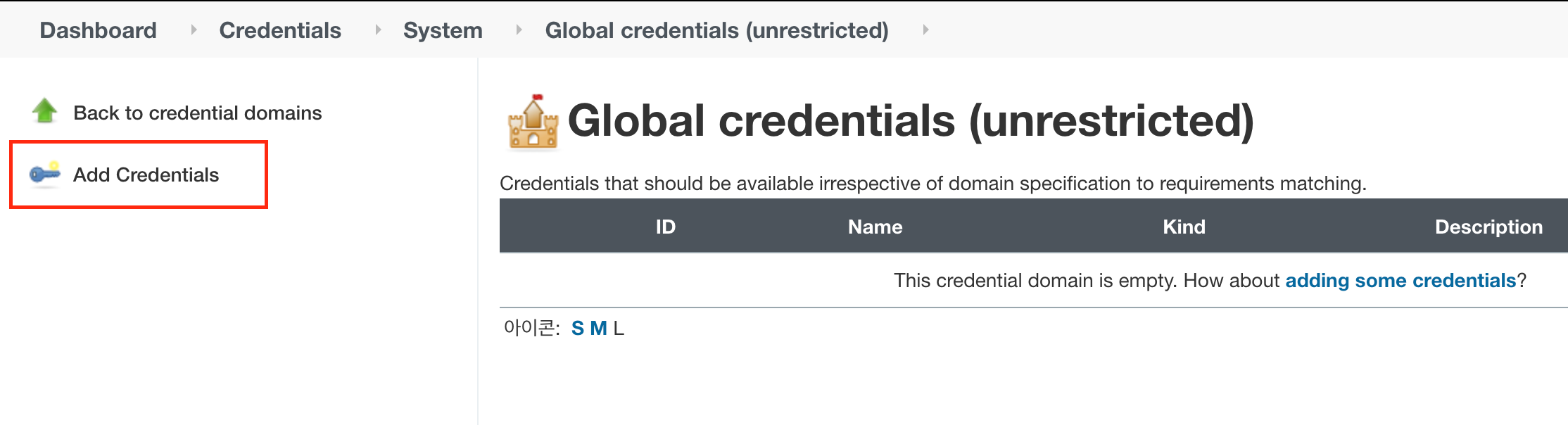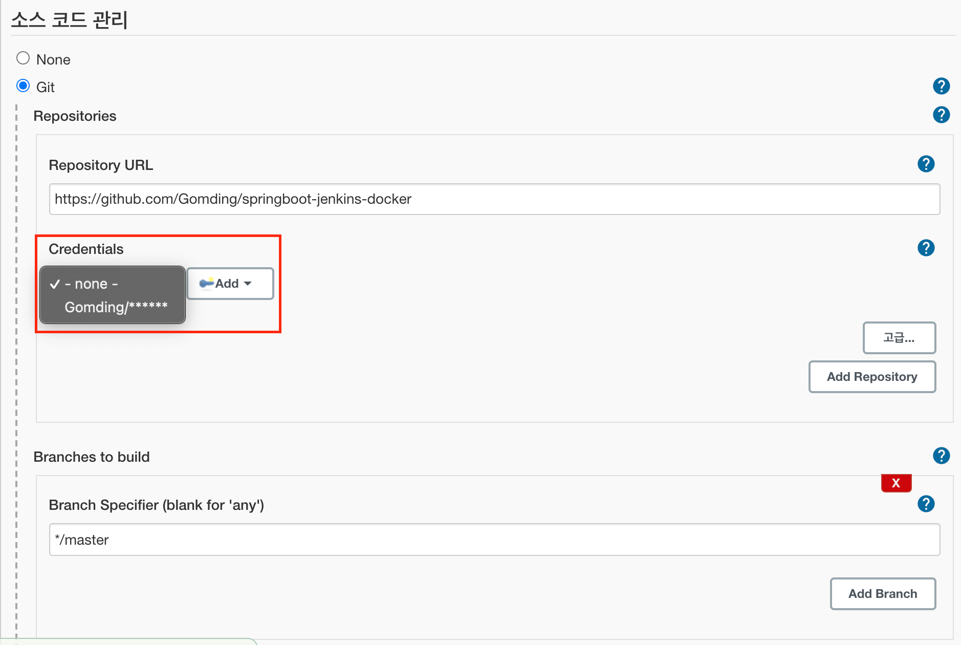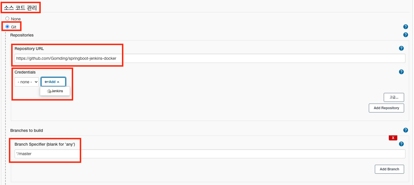Credentials는 Jenkins가 저장소에 접근하기 위한 인증수단을 의미합니다.