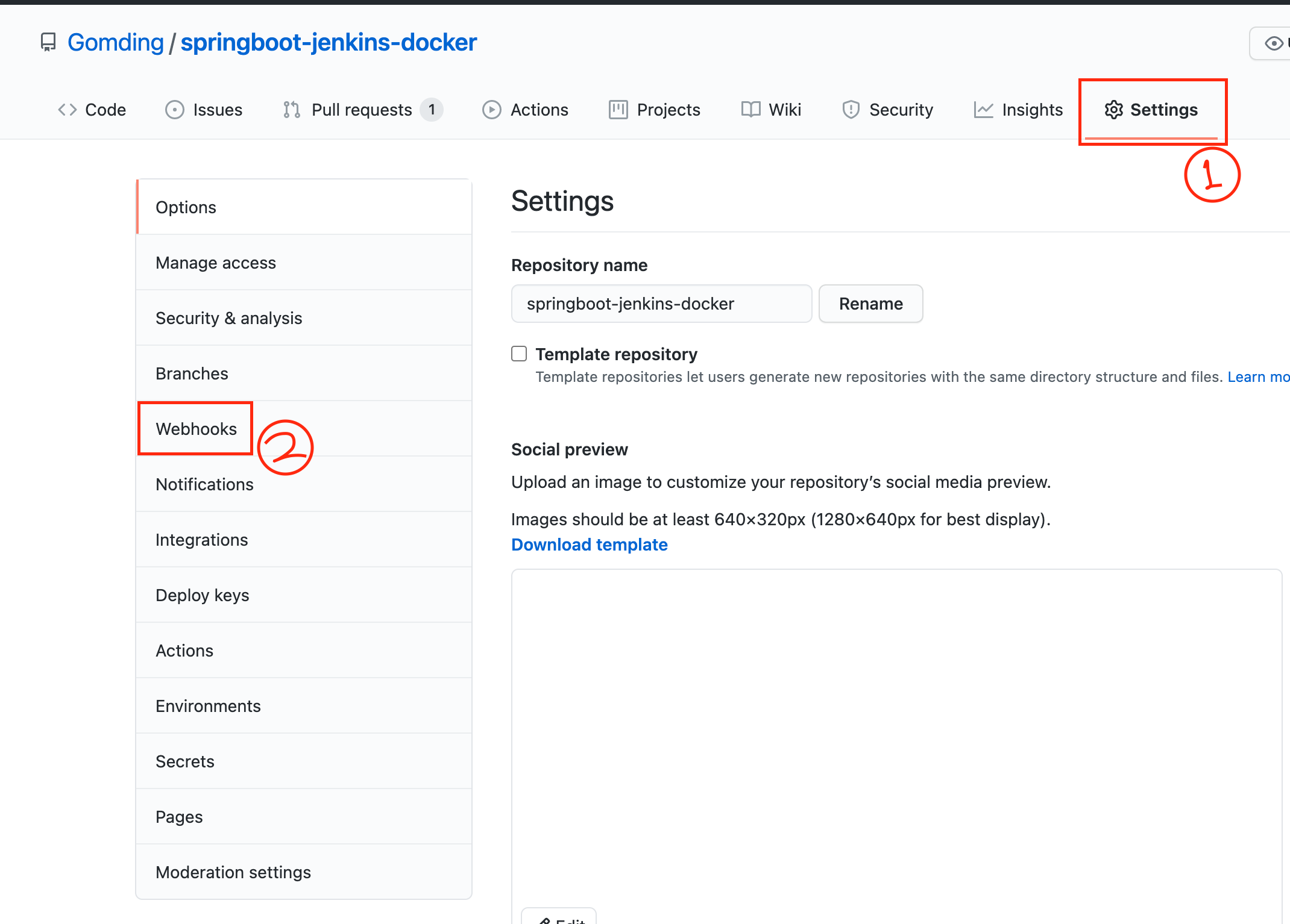 이를 위해서는 Github에서 Webhook을 걸어줘야 합니다. 다시 Github 저장소로 가서 설정을 진행합니다.