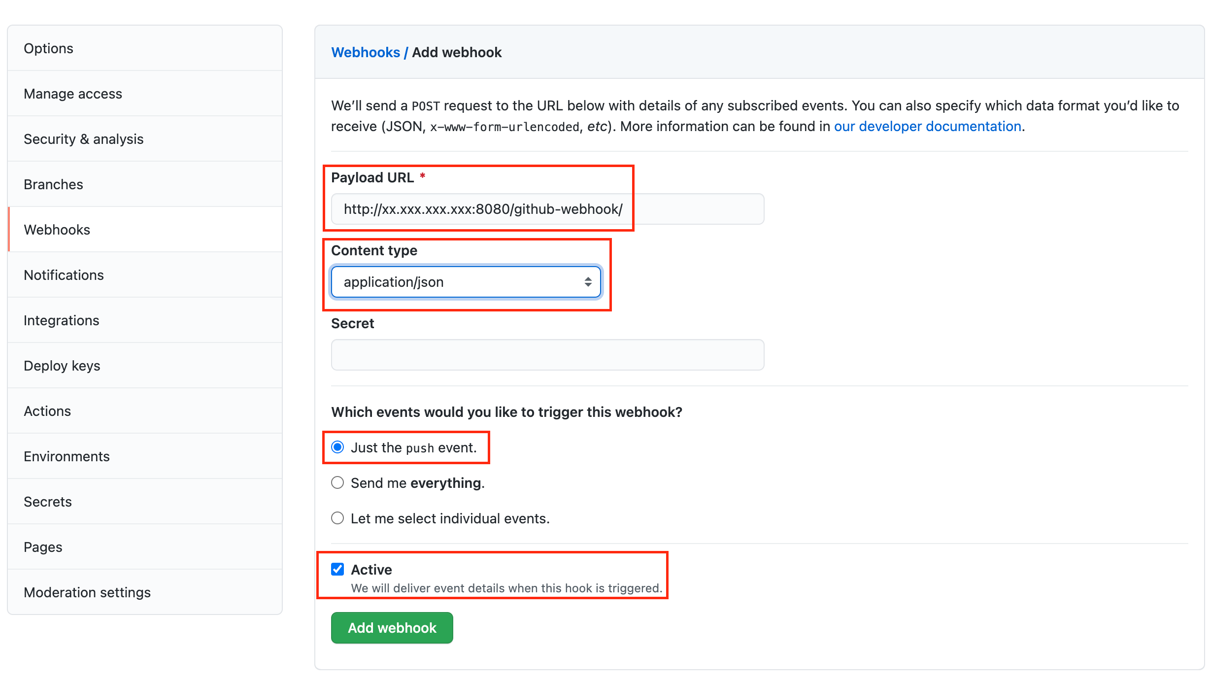 여기서는 push event만 필요하므로 Just the push event에 체크해줍니다.