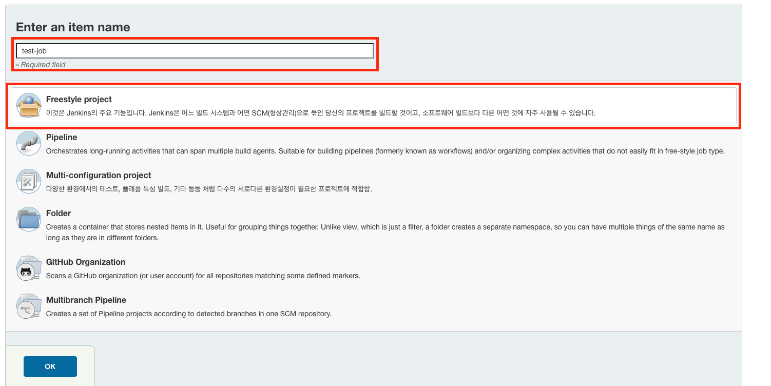 item의 타입은 일단 지금은 Freestyle project 를 선택합니다. (뒤에서 Pipeline에 대해서 설명하겠습니다.)