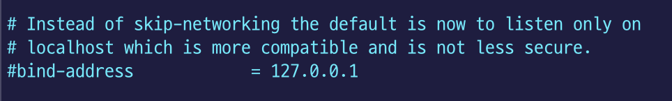 설치 후 아무런 설정을 하지않았다면 bind-address가 127.0.0.1 로 설정되어 있습니다.