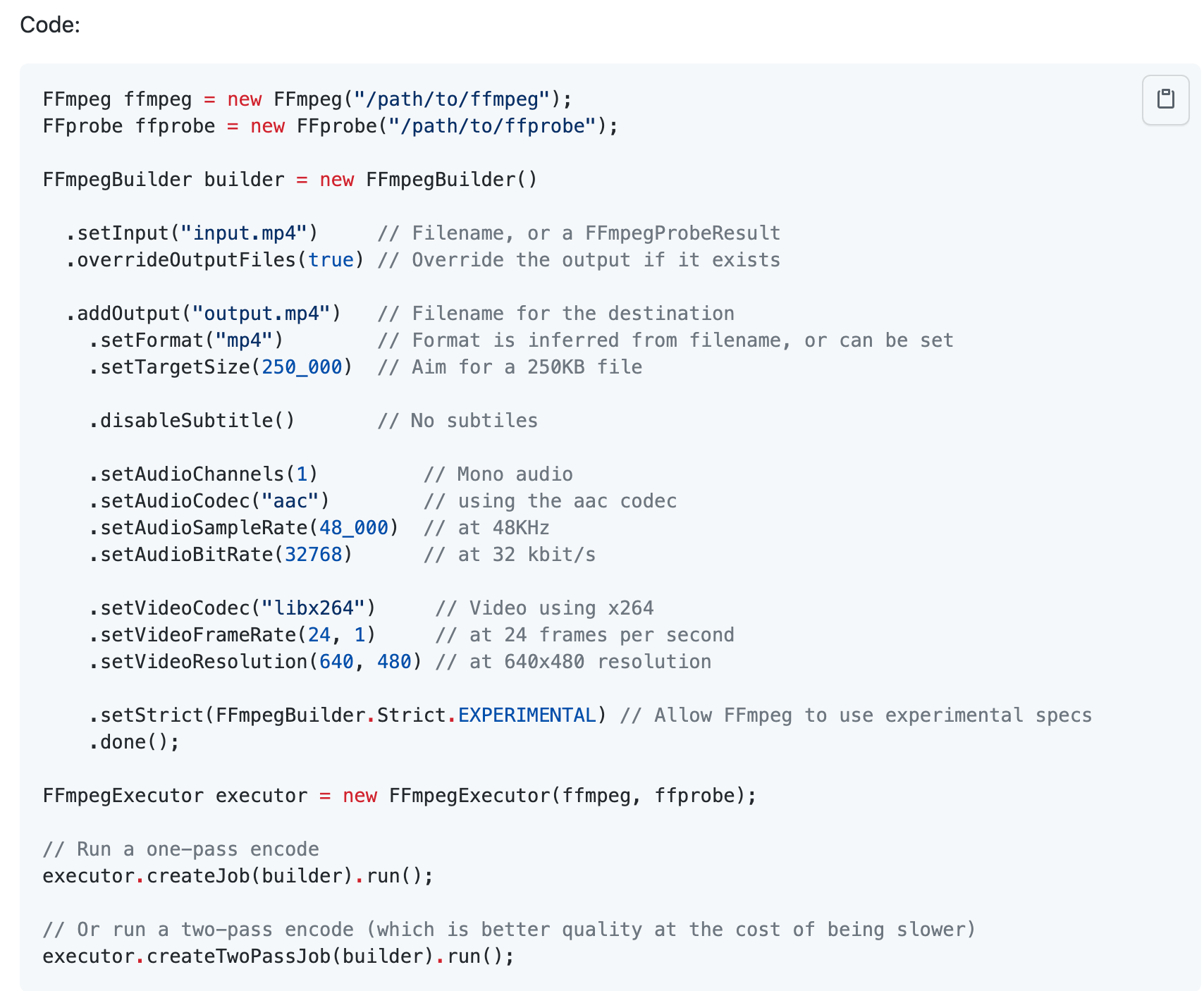 하지만 우리는 Java에서 이 프로그램의 명령을 실행시켜야합니다. 여기서 사용할 수 있는 ffmpeg-cli-warpper 라는 라이브러리가 있었습니다. 아래와 같이 친숙한 코드로 명령을 내릴 수 있습니다. 게다가 method chaining 을 사용해서 코드를 이해하는데도 어렵지 않습니다.