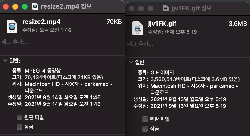 이름은 다르지만 mp4로 변환한 것이 resize2.mp4 파일입니다. 대략 50배의 용량 차이가 났습니다.