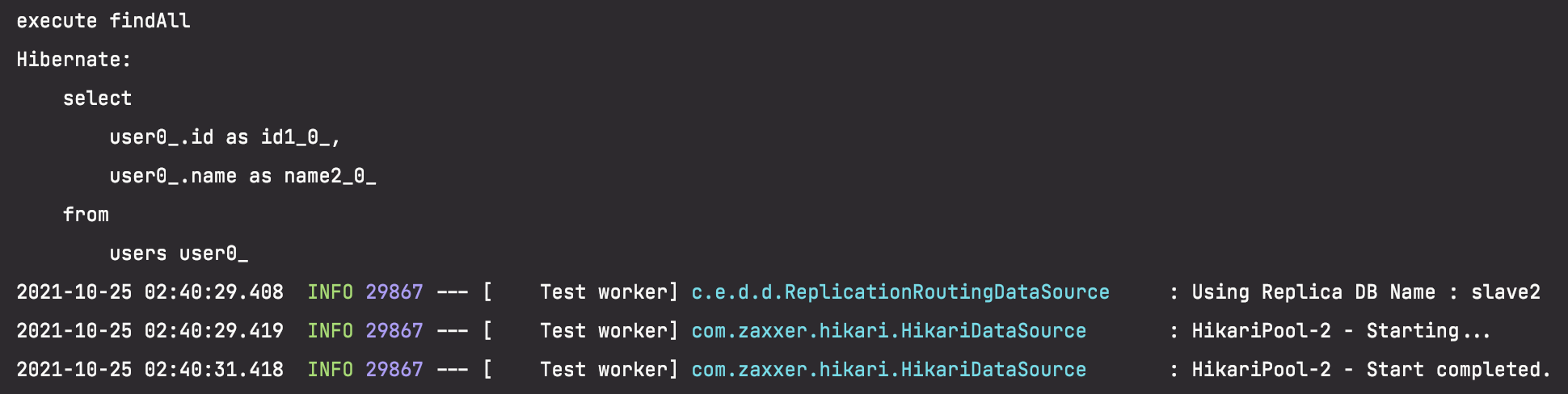 ReplicaDataSourceNames : 이 내부 클래스는 표준이 아닙니다. 개인적으로 만든것인데 여러개의 replica DataSource의 이름을 필드로 가지고 getNextName() 메서드로 Transactional(readOnly=true)인 요청이 올 때마다 replica DataSource를 번갈아가며 사용하기 위해 만들었습니다.