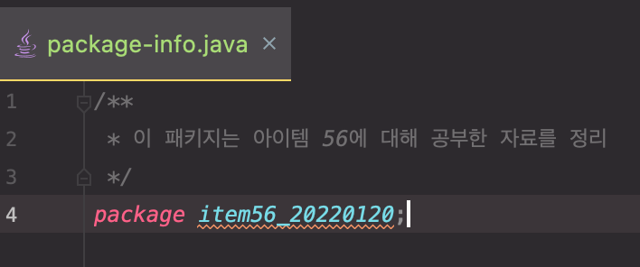 - 패키지를 설명하는 문서화 주석은 package-info.java 파일에 작성한다.