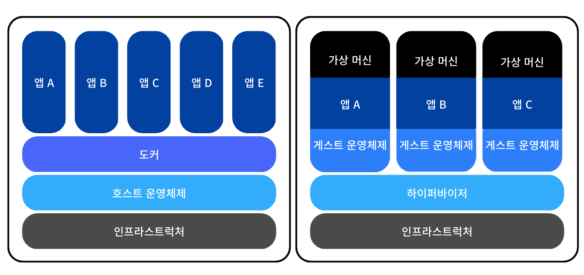 - 하이퍼바이저 위에 가상 머신마다 게스트 운영체제가 존재 그 위에 앱이 위치