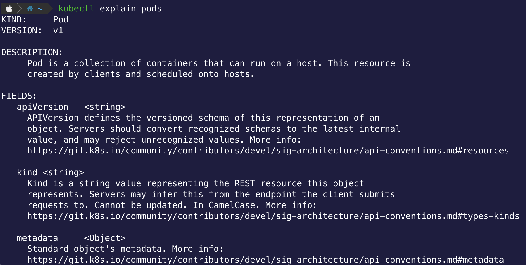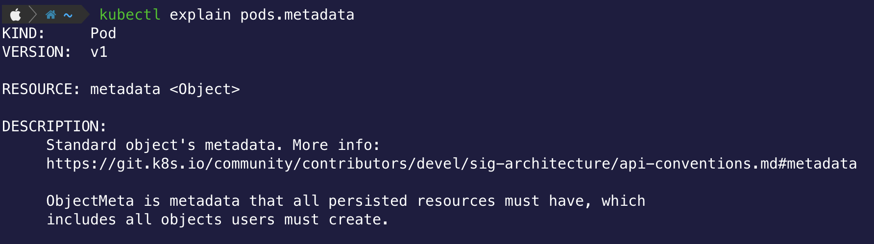 하위 필드의 정보도 확인 가능 kubectl explain pods.metadata 같은 형식
