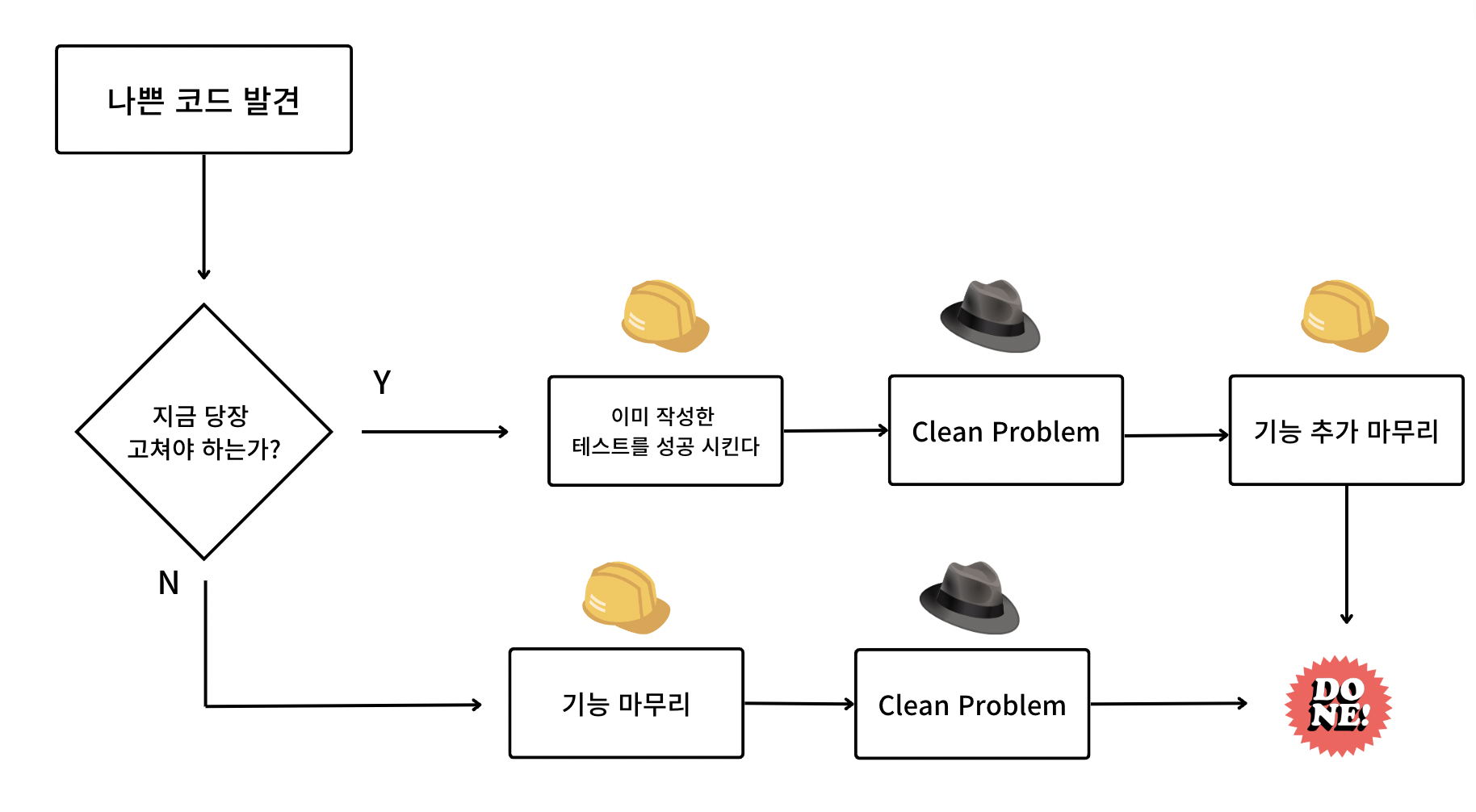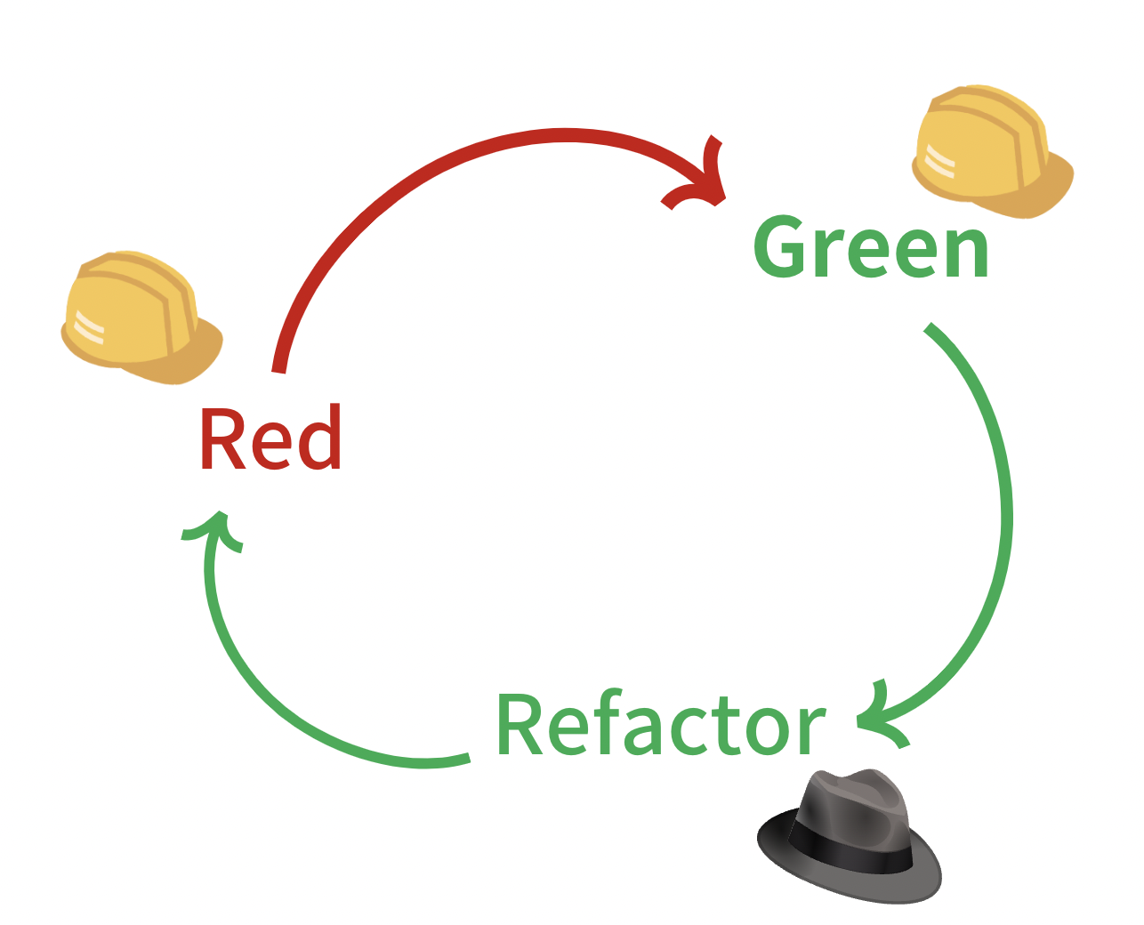 TDD 싸이클에서 2개의 모자를 번갈아 쓰며 코드를 수정하는 것을 알 수 있다.