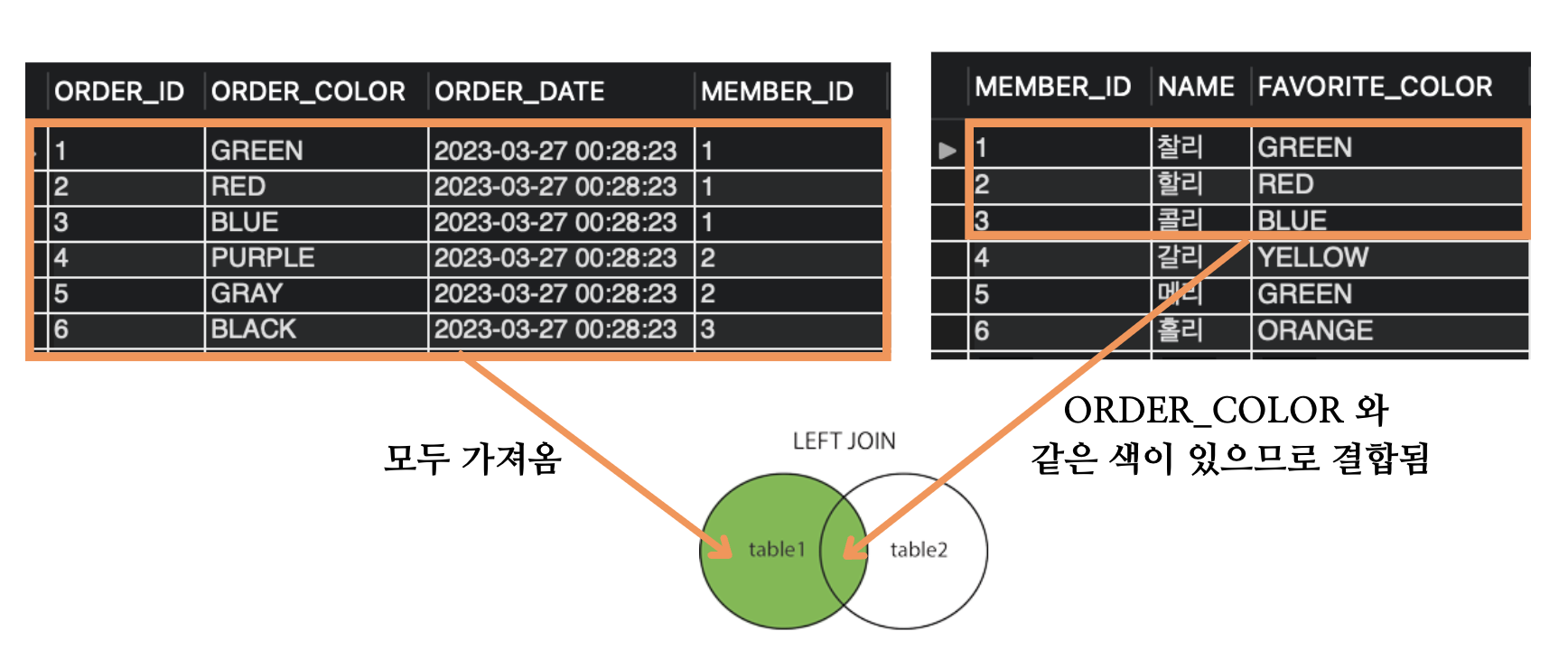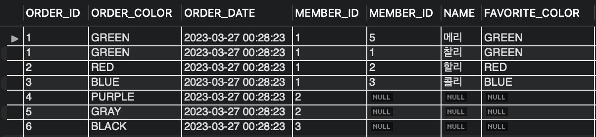 ORDERS 의 데이터를 모두 가져오는데 MEMBER의 FAVORITE_COLOR 가 ORDERS의 ORDER_COLOR와 같은 행만 MEMBER 데이터가 결합된 것을 볼 수 있다.