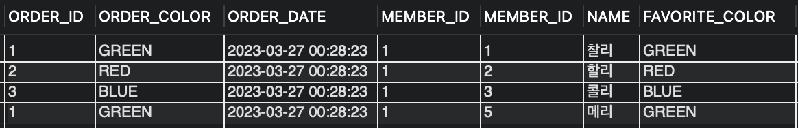 ORDERS 의 ORDER_COLOR 와 MEMBER의 FAVORITE_COLOR 가 같을 때 행을 결합하여 가져오는것을 볼 수 있다.