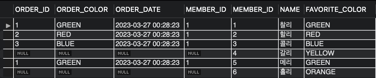 MEMBER 의 데이터를 모두 가져오는데 ORDERS의 ORDER_COLOR 가 MEMBER의 FAVORITE_COLOR와 같은 행만 MEMBER 데이터가 결합된 것을 볼 수 있다.
