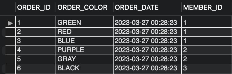 insert into ORDERS(ORDER_COLOR ,ORDER_DATE, MEMBER_ID) VALUES('PURPLE', now(), 2);