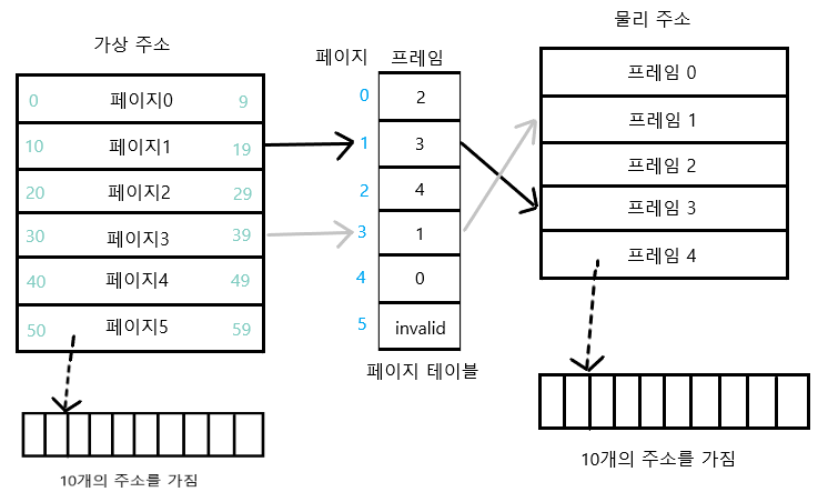 아래 그램에서 가상 주소공간과 물리 주소 공간을 똑같이 10B로 나누었고, 이에 따라 한 페이지 또는 한 프레임은 총 10개의 주소를 가집니다.