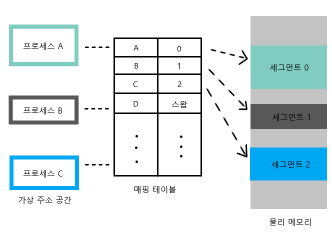 가변 분할 방식을 이용한 가상 메모리 관리 기법으로, 물리 메모리를 프로세스의 크기에 따라 가변적으로 나누어 사용합니다.