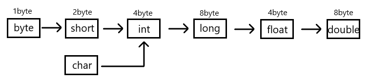 위의 표는 왼쪽부터 오른쪽으로 표현할 수 있는 값의 범위가 넓은 쪽으로 나열한 것입니다. 화살표 방향으로 형변환을 하면 자동 형변환이 가능합니다.
