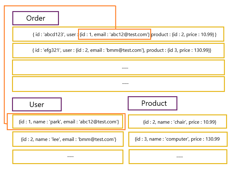 NoSQL은 join대신 데이터를 복제해서 각 컬렉션 일부분에 속하는 데이터를 정확하게 산출하도록 합니다.