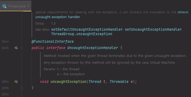 Java 에서 기본적으로 정의된 UncaughtExceptionHandler가 실행이 됩니다.