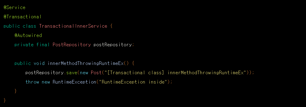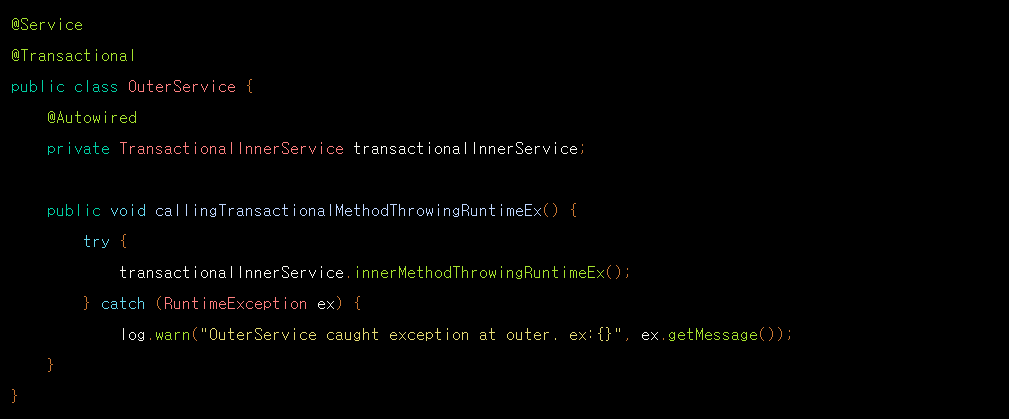 위의 코드는 OuterService에 있는 메서드는 클래스의 트랜잭션 선언에 의해 트랜잭션메서드가 됩니다. 그리고 그 메서드는 또 다른 트랜잭션 클래스의 메서드를 호출합니다. 호출된 내부 메서드는 결과적으로 마지막에 RuntimeException을 던집니다.