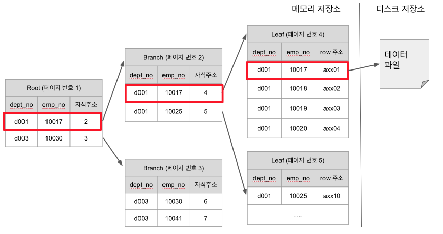 - 예를들어 Branch(페이지 번호2)의 첫번째 행은 dept_no가 d001이면서 emp_no가 10017 ~ 10024까지인 Leaf의 부모로 있습니다.