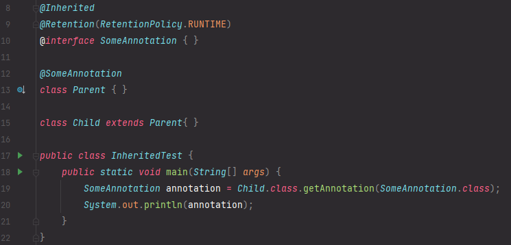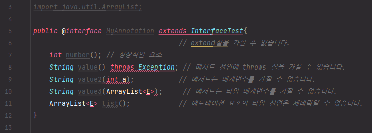 - extends 절을 가질 수 없습니다.(애노테이션 타입은 암묵적으로 java.lang.annotation.Annotation을 상속합니다.)