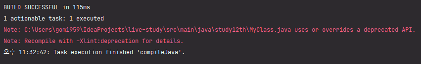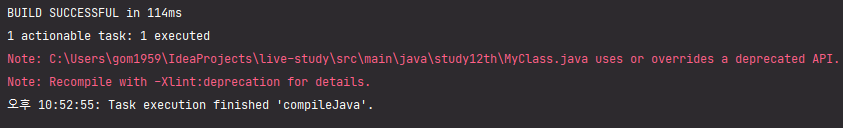 만약 @Deorecated 가 있는 대상을 코드에 사용하여 컴파일 하면 다음과 같은 결과가 발생합니다.