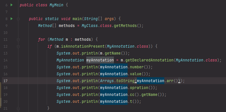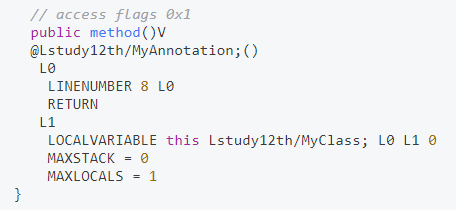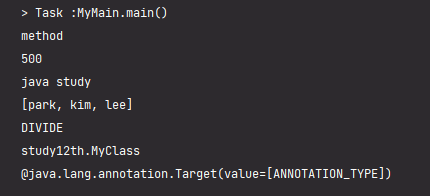 - MyAnnotation이 붙어있는 메서드라면 getDeclaredAnnotation(MyAnnotation.class)를 사용해서 어노테이션을 변수에 초기화 시킵니다.