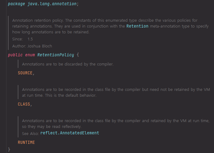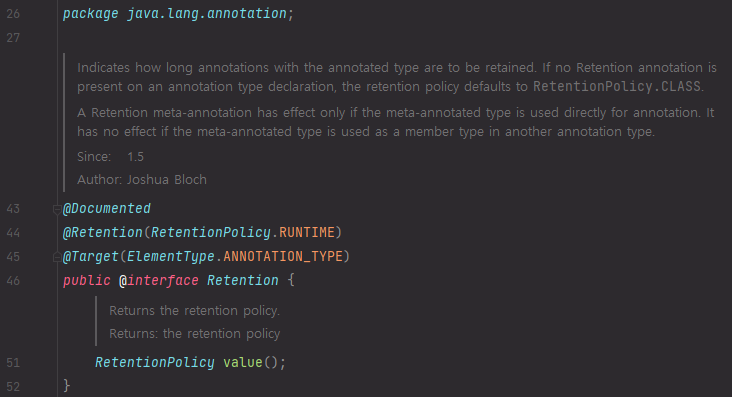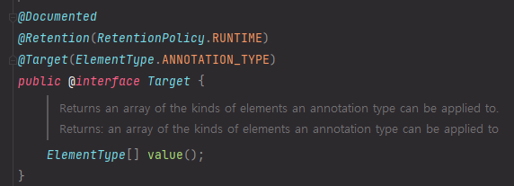 - 애노테이션의 적용대상(target), 유지기간(retention)등을 지정하는데 사용됩니다.