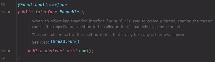대표적인 함수형 인터페이스로 얼마전에 배운 Runnable 인터페이스가 있습니다.