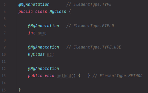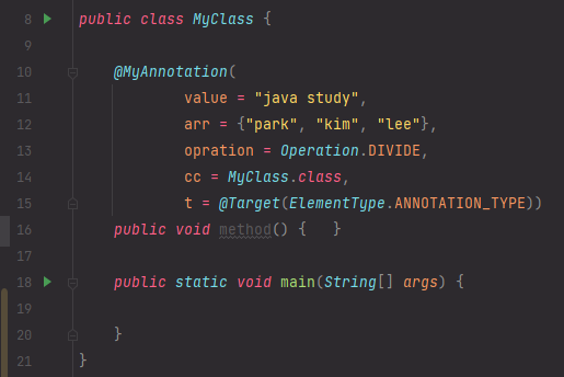 아래 코드는 자바 리플렉션을 사용해서 MyClass 의 method()에 적용된 MyAnnotation의 요소값들을 가져오는 실행 코드입니다. 간단하게 순서를 정리하자면 다음과 같습니다.