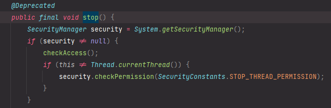 여기서는 Thread 클래스의 stop() 메서드를 사용했습니다.