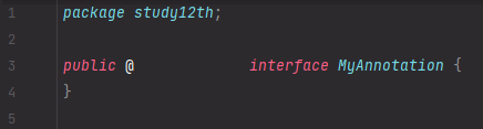 '@interface'는 애노테이션 타입(annotation type)을 선언하는 키워드 입니다. 애노테이션 타입 선언을 일반적인 인터페이스(interface) 선언과 구분하기 위해 interface 앞에 기호 @를 붙입니다.