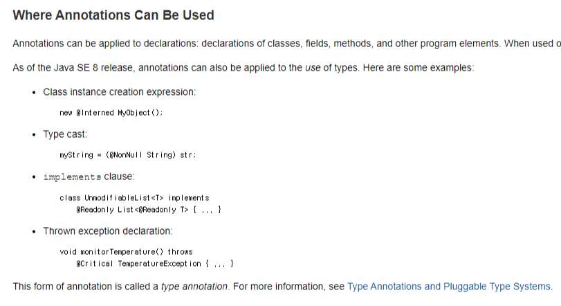 위의 문서를 보면 자바 8에서는 다음과 같은곳에도 애노테이션을 사용할 수 있습니다.