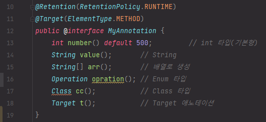 - 요소의 타입은 기본형, String, enum, 애노테이션, Class만 가질 수 있습니다.