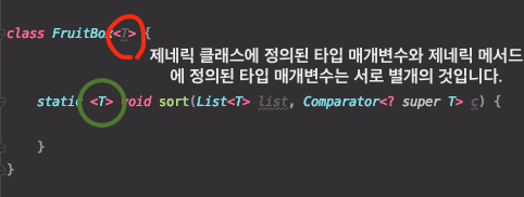 메서드 선언에 사용되는 형식(formal) 매개 변수와 매우 비슷합니다. 제네릭은 타입 매개변수를 입력받아서 동일한 코드를 재사용 할 수 있는 방법을 제공합니다.