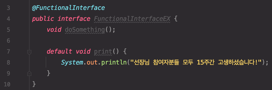 아래는 디폴트 메서드 하나와 추상메서드 하나를 가지는 인터페이스 입니다. 이 또한 함수형 인터페이스의 조건을 충족하기때문에 정상적으로 컴파일됩니다.