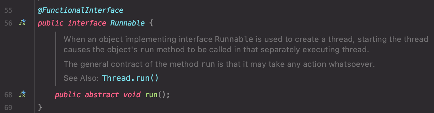 - 이 Runnable이 대표적인 함수형 인터페이스 중 하나입니다.