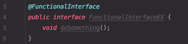 아래는 추상메서드를 하나도 가지지 않은 인터페이스 입니다. 함수형 인터페이스의 조건을 충족하지 못하므로 @FunctionalInterface 에서 컴파일 에러를 발생시킵니다.
