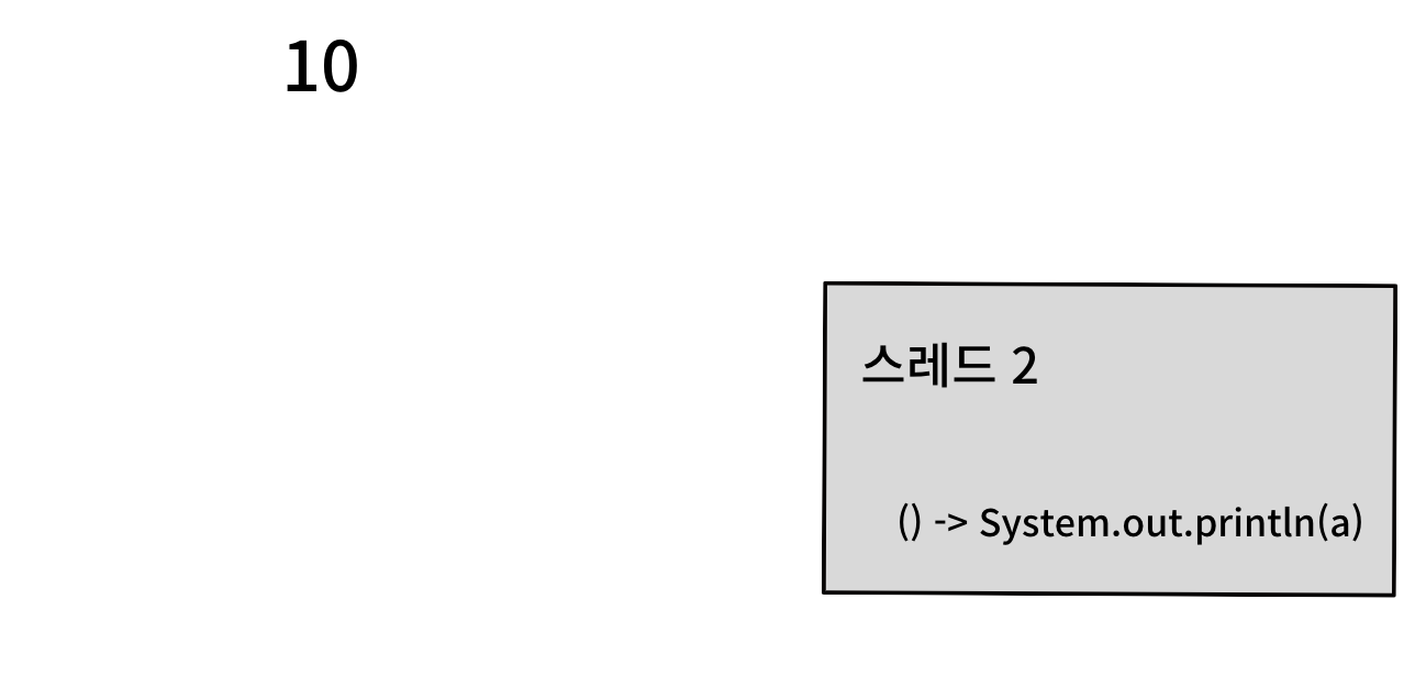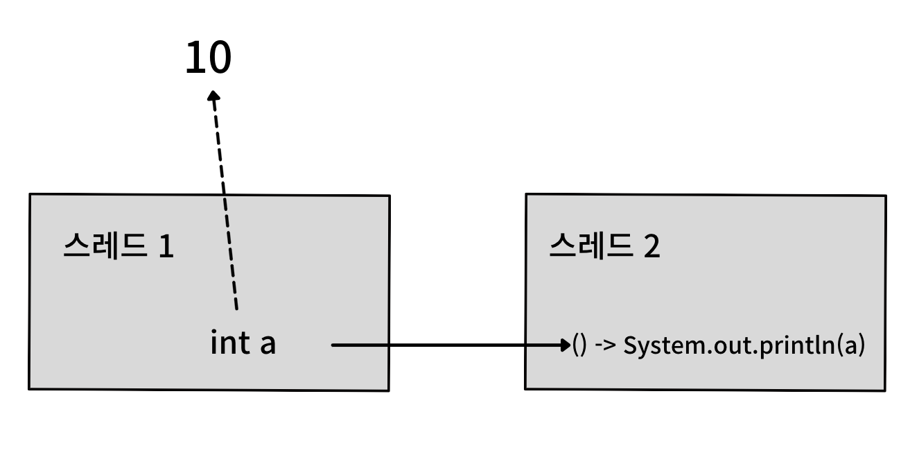 람다는 지역 변수에 바로 접근할 수 있다는 가정하에 람다가 스레드에서 실행된다면 변수를 할당한 스레드가 사라져서 변수 할당이 해제되었는데도 람다를 실행하는 스레드에서는 해당 변수에 접근하려 할 수 있습니다.