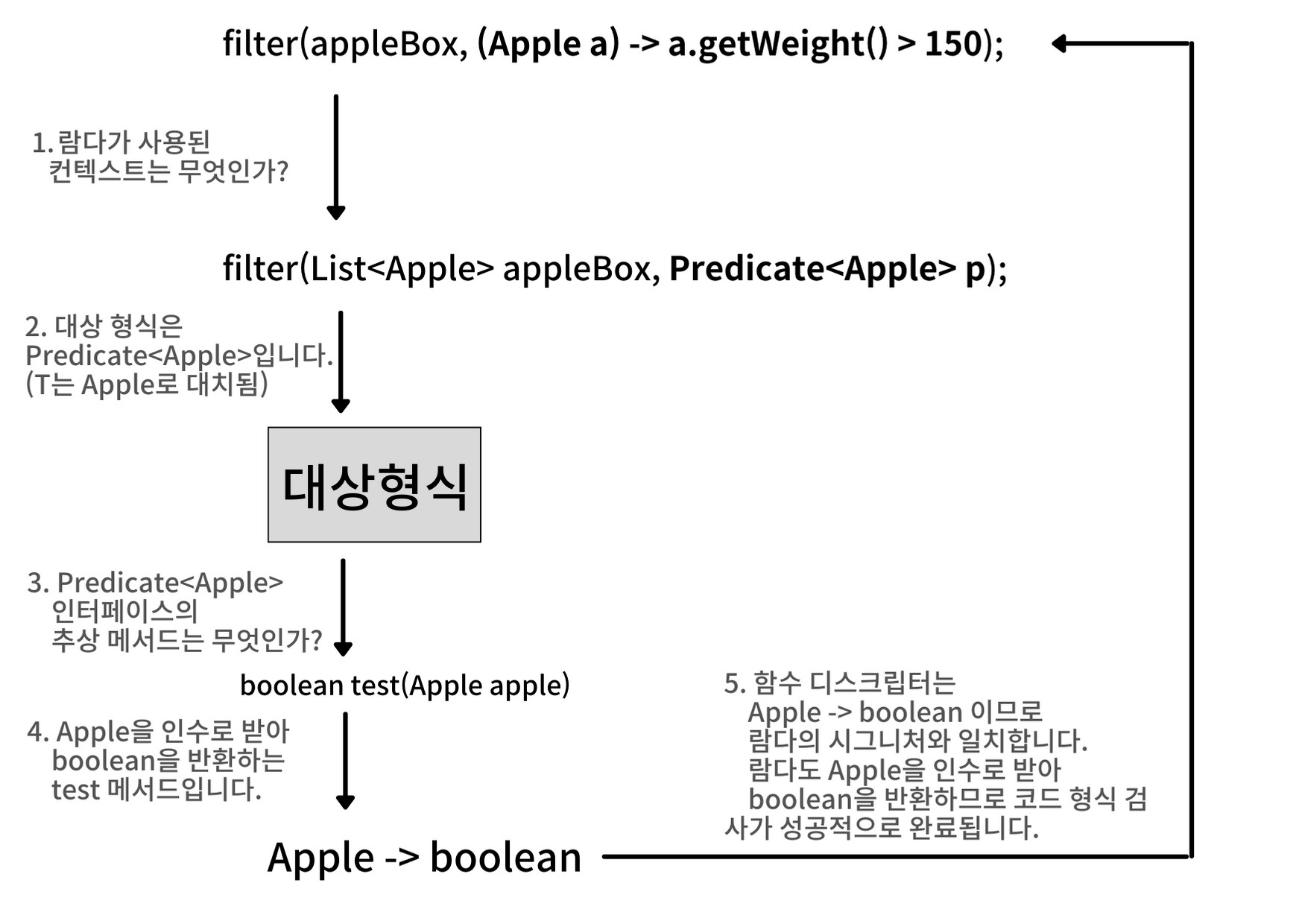 즉, 대상 형식을 이용해서 함수 디스크립터를 알 수 있으므로 컴파일러는 람다의 시그니처도 추론할 수 있습니다.