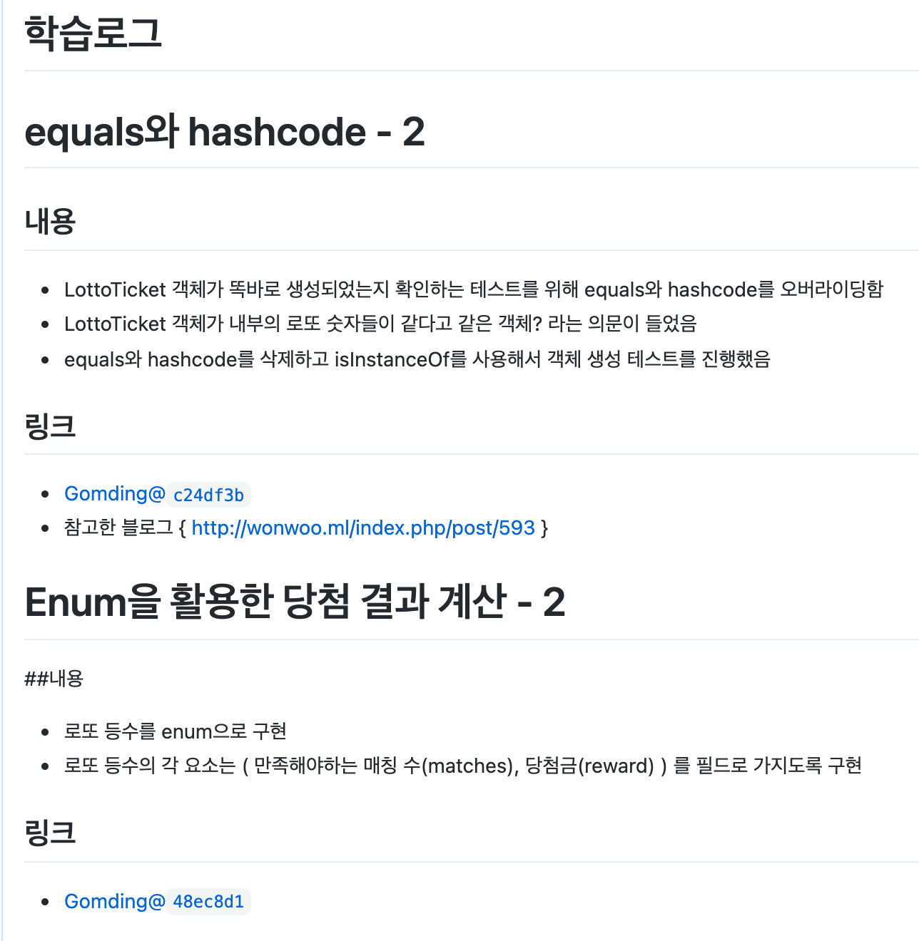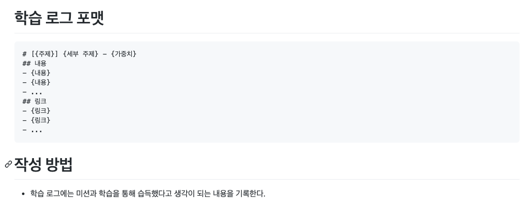 - 링크는 해당 학습 로그에서 학습한 부분이 반영된 코드 링크(깃허브 커밋)가 될 수도 있다.