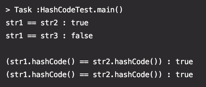 String 의 hashCode를 사용해서 비교해보면 값이 같으면 같다고 하는 동등성 비교를 하고있습니다.