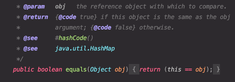 자바 모든 클래스의 최상위 클래스 Object 에 정의된 equals 메서드는 아래와 같습니다.