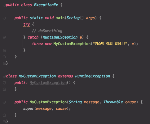 throw new CustomUncheckedException("커스텀 언체크드 예외 발생!!", e);