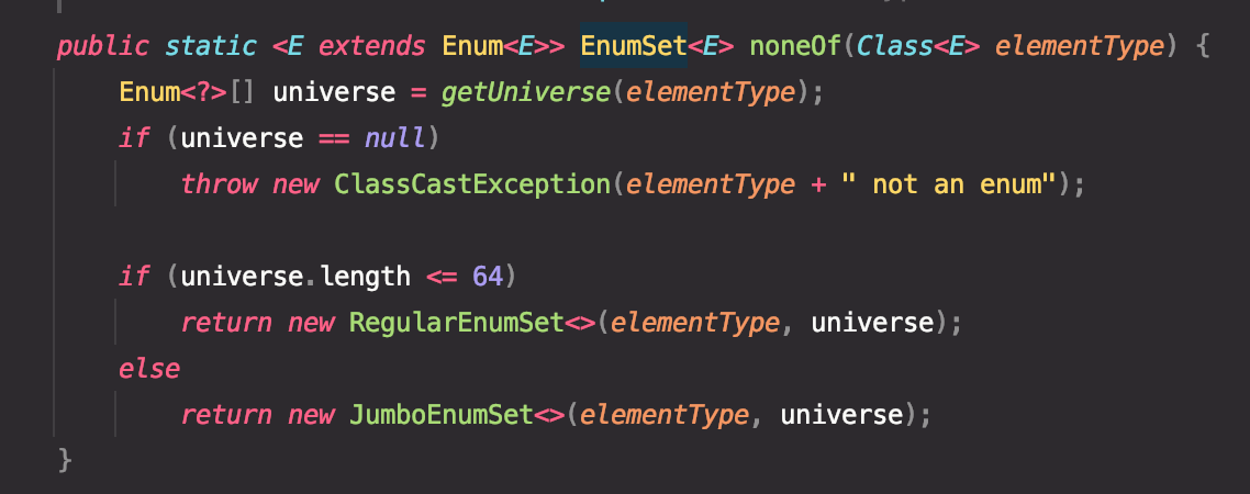 - 요소의 개수가 64개 이하면 RegulatEnumSet 의 인스턴스를 반환