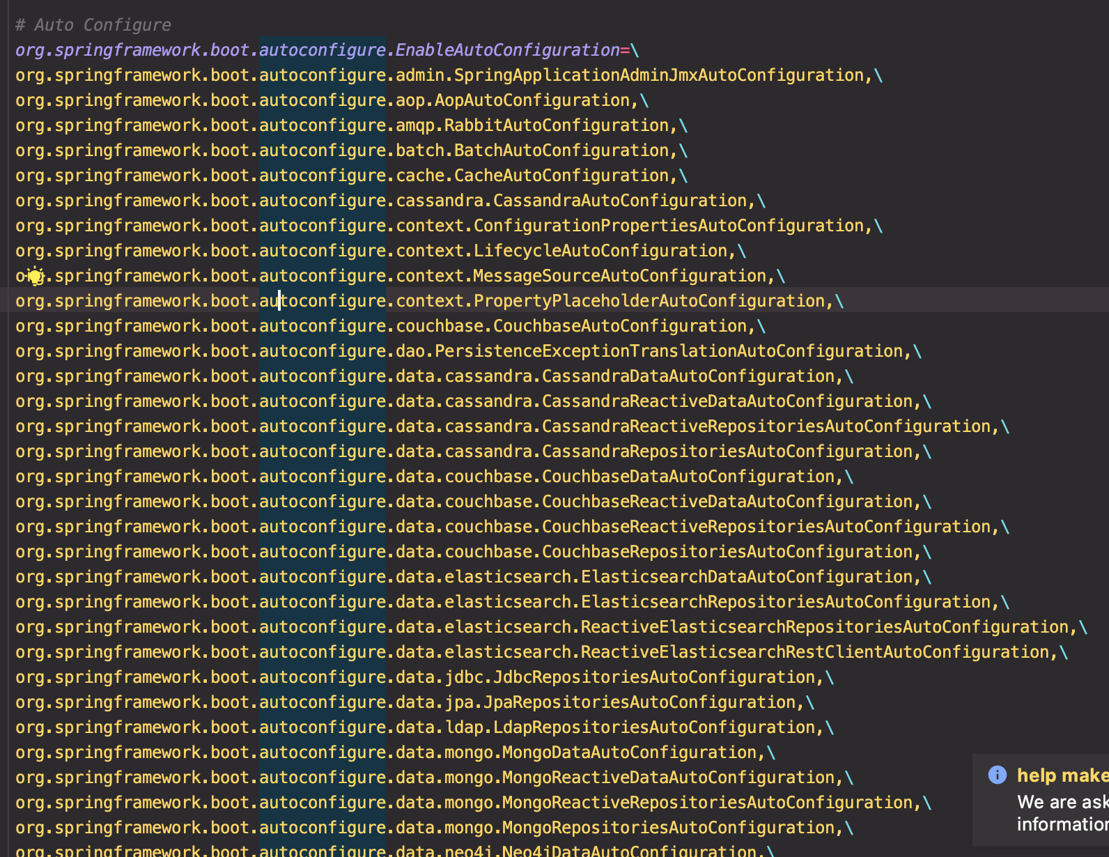 - @EnableAutoConfiguration : 자동설정의 핵심 애너테이션. spring-boot-autoconfigure 안에 spring.factories파일의 키값 EnableAutoConfiguration의 뱉류값들을 자동 설정 빈으로 등록합니다.