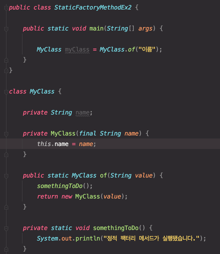 즉, 정적 팩터리 메서드는 public 생성자가 아닌 메서드를 사용해서 객체의 인스턴스를 제공해줍니다.